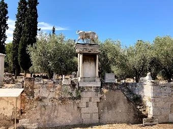 Kerameikos is an area of Athens, Greece, located to the northwest of the Acropolis, which includes an extensive area both within and outside the ancient city walls, on both sides of the Dipylon Gate and by the banks of the Eridanos River. It was the potters' quarter of the city, and was also the site of an important cemetery and numerous funerary sculptures erected along the Sacred Way.