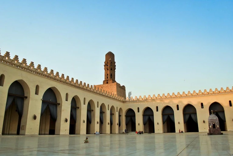 The Mosque of al-Hakim bi-Amr Allah is the fourth oldest mosque in Egypt, and the second largest after the Mosque of ibn Tulun. The construction of the mosque was begun by al-Hakim’s father, the Fatimid Caliph al-Aziz bi Allah in 990 AD, but he died before its completion, leaving his son to finish it. The main entrance lies on the western facade of the mosque, and is monumental in size and design. It is one of the oldest architectural examples of projecting entrances, and was influenced by the great Mosque of Mahdiya in Tunis. The plan of the mosque consists of a triangle with four arcades centering a courtyard. Two minarets flank either side of the façade. The mosque has undergone several restoration phases throughout the years. The mosque has a long and intriguing history, including its role as a barracks during the French campaign, when its minarets were utilized as watch-towers. Its qibla arcade was used as a museum of Islamic art called the House of the Arab Antiquities.