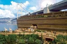 Life-size statues of animal pairs in a verdant garden around a colossal ark, plus an adventure area.