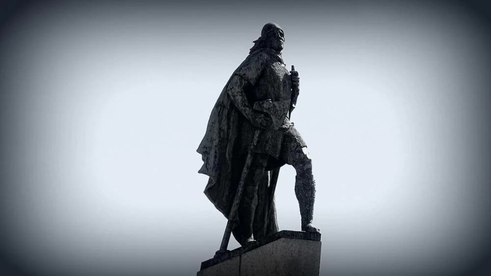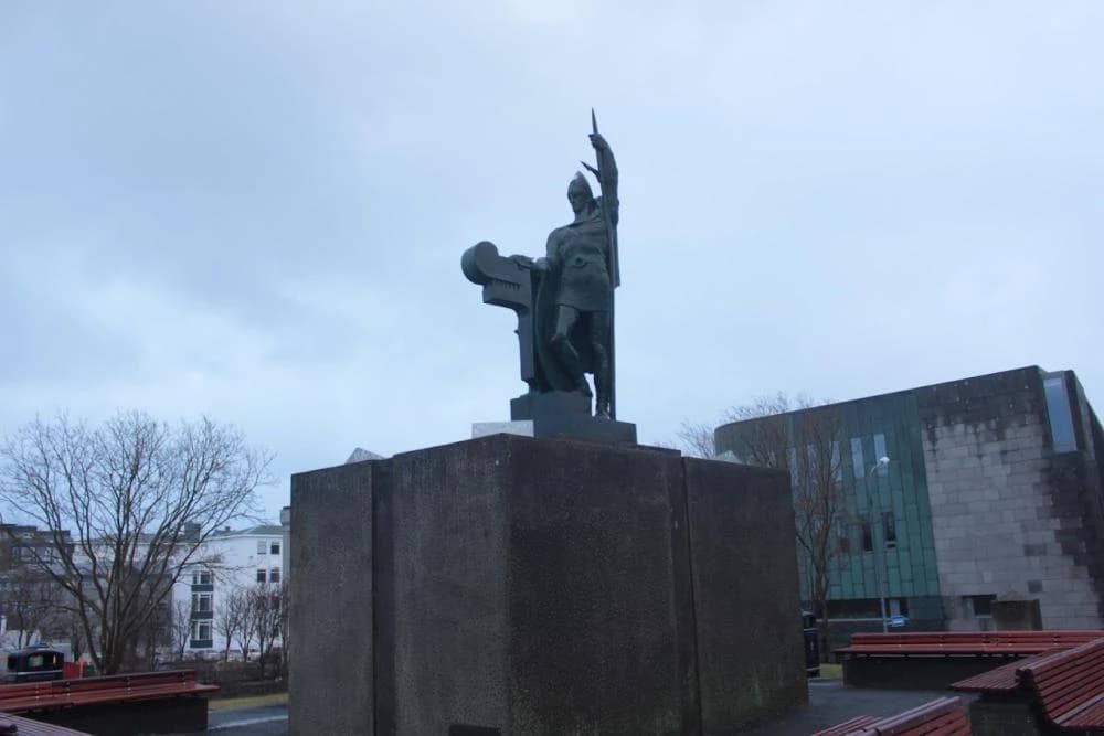 The statue shows Ingólfur standing firm by the mast of his ship, holding a shield and a spear, looking protectively over the city he settled.