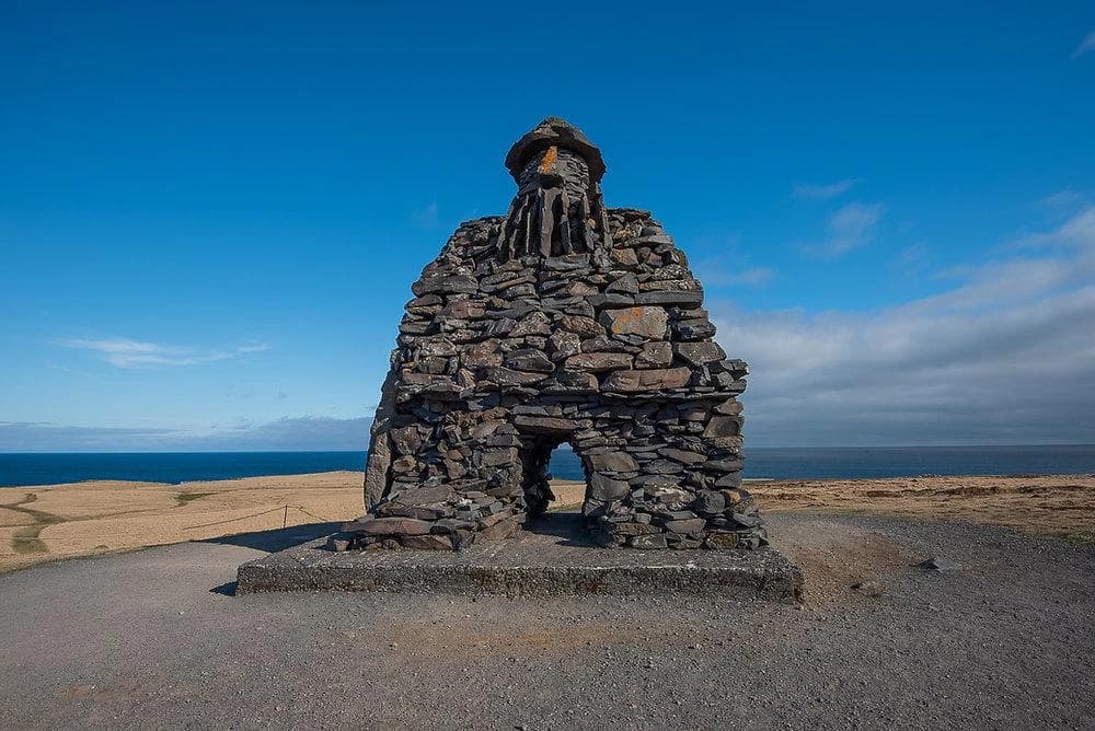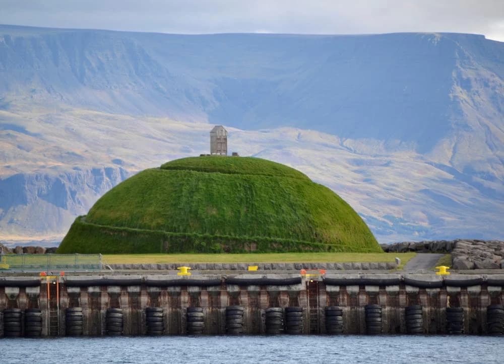 Þúfa was designed by the Icelandic artist Ólöf Nordal, who sought to create a place of serenity and meditation in the bustling capital city. The piece is a large, grassy, dome shaped hillock with a walking path encircling it to the top. Here, there is an old fishing shed, the kind used historically to wind-dry fish, as a callback to Iceland’s past. Fishing was the lifeblood of the country for centuries, and how Icelanders managed to work in the tumultuous seas, harvest their catch, and utilise it for lasting food, clothing and oil, is a fascinating story.