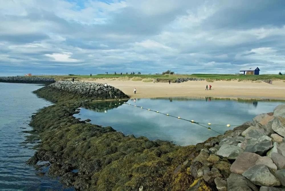 Nauthólsvík is a Seaside resort and a small neighbourhood in Reykjavík, the capital city of Iceland, about 900 metres from Perlan. It has a beach with an artificial hot spring – hot water is pumped into a man-made lagoon.