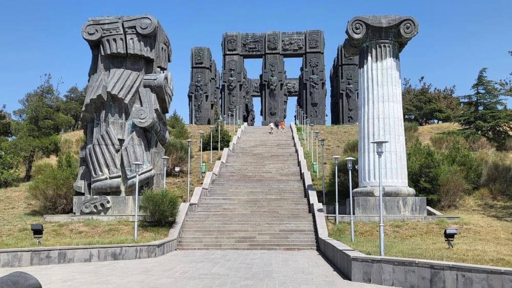 The Chronicle of Georgia is a monument located near the Tbilisi sea. It was created by Zurab Tsereteli in 1985 but was never fully finished. The monument sits at the top of a large set of stairs.