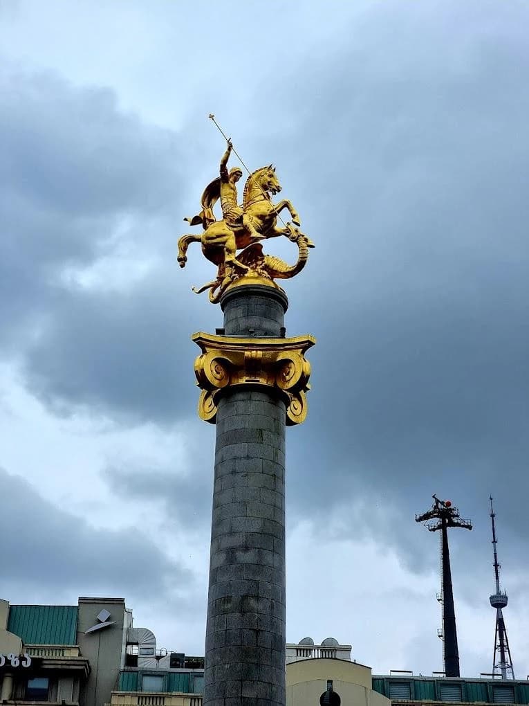 The Freedom Monument, commonly known as the St. George Statue, is a memorial located in Tbilisi, Georgia, dedicated to the freedom and independence of the Georgian nation. Unveiled in 2006 in Tbilisi's central square, the monument of granite and gold is 35 metres high and is easily spotted from any point of the city.