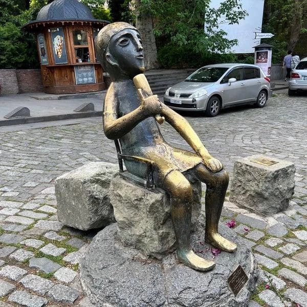 The sculpture of a man holding a horn in Tbilisi is modeled on an ancient Colchian statuette and is affectionately known as ‘Tamada’ (Georgian: თამადა) – toastmaster at Georgian feasts. The sculpture can be found at the beginning of Bambis Rigi Street near Shardeni Street (named after a French explorer Jan Chardin, who visited Tbilisi in 1863).