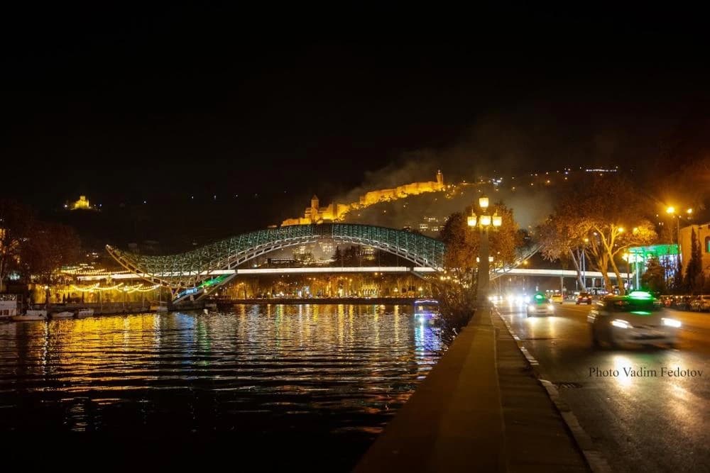 The Bridge of Peace is a bow-shaped pedestrian bridge, a steel and glass construction illuminated with numerous LEDs, over the Kura River, linking the Rike Park with Old town in central Tbilisi.